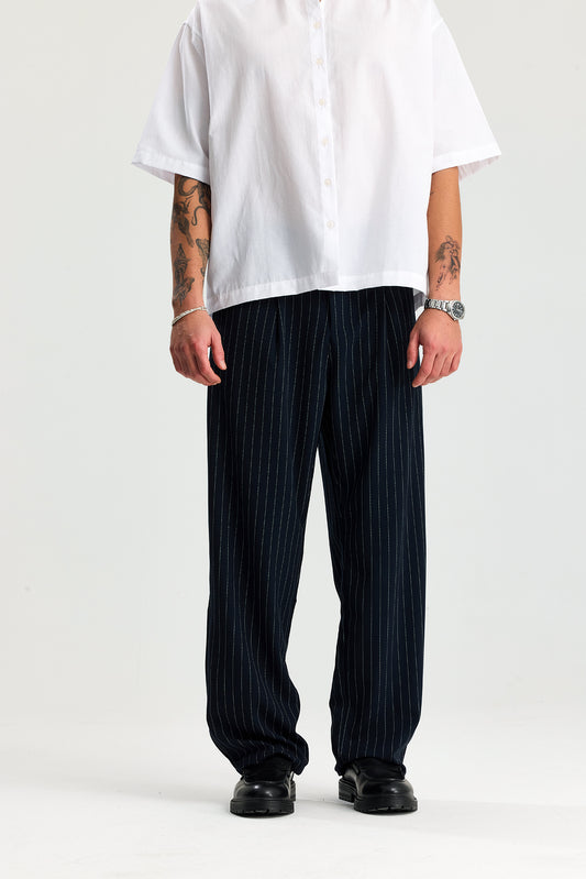Beyaz Çizgili Baggy Fit Kumaş Pantolon - Lacivert