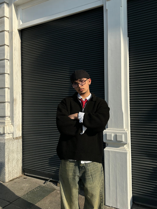 TükendiSiyah Yarım Fermuarlı Triko